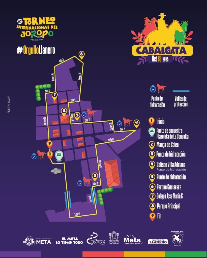 Este jueves 30 de octubre, a partir de la 3:00 p.m., se realizará en Cumaral la tradicional cabalgata del Torneo Internacional del Joropo. El punto de encuentro será la Plazoleta de La Consulta, desde donde jinetes y familias iniciarán un recorrido que pasará por el Parque Cumarera y finalizará en el Parque de la Carrera 21.