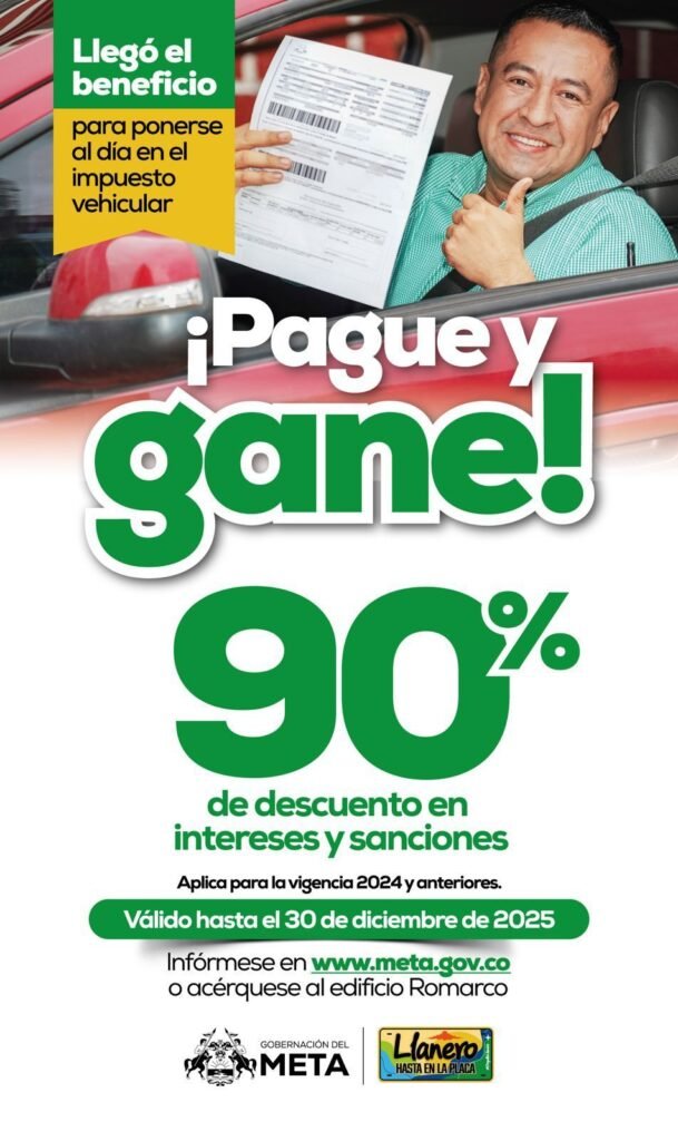 Según César Charry Castellanos, gerente de Rentas del departamento, quienes se pongan al día antes del 30 de diciembre podrán acceder a un descuento del 90% en intereses y sanciones. Para quienes paguen entre enero y el 27 de febrero, el alivio será del 50%.