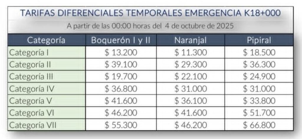 La medida contempla descuentos del 50% para las categorías 4 a 7 (vehículos de carga y buses) y del 30% para las categorías 1 a 3 (automóviles y camionetas). Estos beneficios aplican en los peajes: Boquerón I, Boquerón II, Pipiral y Naranjal (antes Puente Quetame).