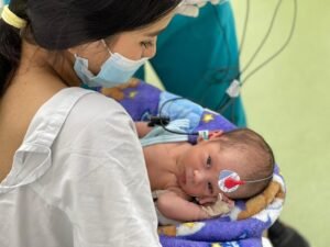 “El examen de tamizaje auditivo es un procedimiento rápido, indoloro y seguro que realizamos en los primeros días de vida. Nos permite identificar de manera temprana cualquier posible alteración auditiva y así iniciar intervenciones oportunas que favorecen el desarrollo del lenguaje y la comunicacióny la calidad de vida de los niños del departamento del Meta”, explicó la doctora Alejandra Toro, líder del servicio de Tamizaje Auditivo Neonatal.