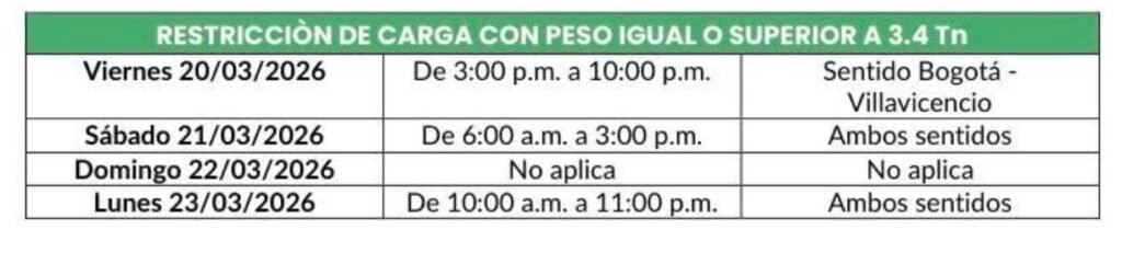 Para el lunes 23 de marzo, se realizará reversible con cierre en el sector de Uval hacia la 1:00 p.m., con el fin de habilitar un solo sentido de circulación desde Villavicencio hacia Bogotá entre las 3:00 p.m. y las 10:00 p.m., para facilitar el retorno de los viajeros.